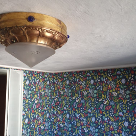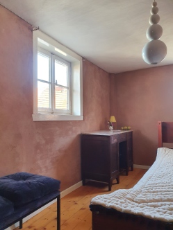 und Schreibtisch, Garderobe, ein Kunstwerk, die Räume haben Dielenböden und Lehmputzwände. Es gibt eine moderne Andienküche, zwei Bäder, eine Waschküche mit Toilette,
